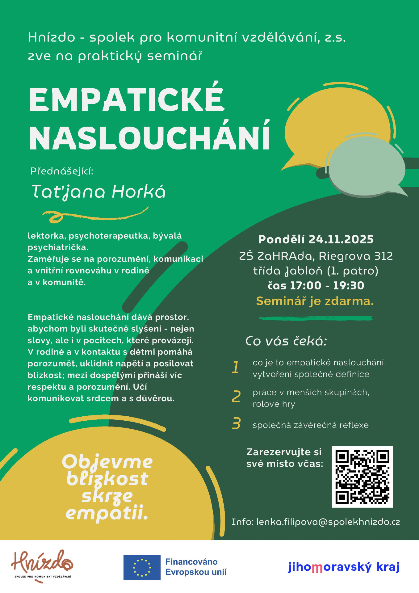 Zveme všechny členy Hnízda, rodiče našich škol i širší tišnovské komunity na praktický seminář Empatické naslouchání, který povede zkušená lektorka a psychoterapeutka Taťjana Horká.