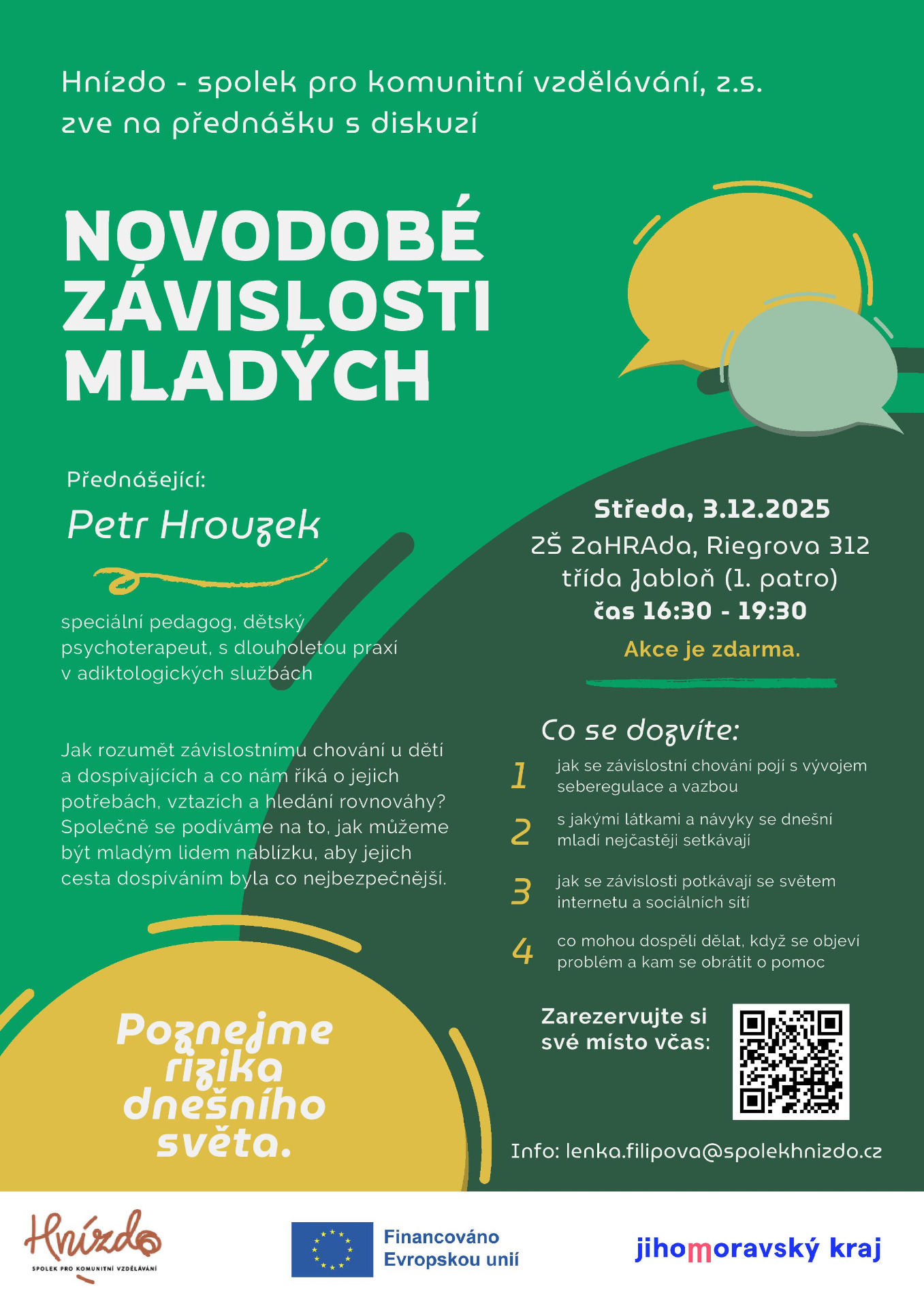 Přednáška je zdarma, je financovaná z projektu Jihomoravského kraje – Podpora rodičovství a rodinné stability.