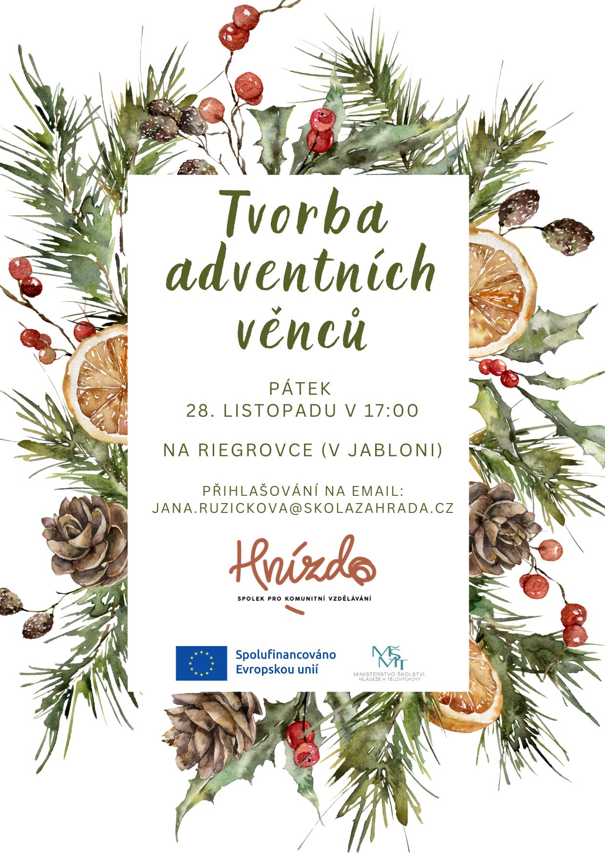 Listopad už má svou vlastní vůni a tempo, které nás často vybízí na chvíli zpomalit. A právě proto je krásné se setkat, zastavit a nadechnout se jehličí místo každodenního spěchu. Srdečně zveme všechny, kdo si chtějí dopřát tvořivý podvečer a začít advent s rukama od chvojí, ne od klávesnice. Tradiční výroba adventních věnců proběhne ve čtvrtek 28. listopadu v 17:00 na Riegrovce.