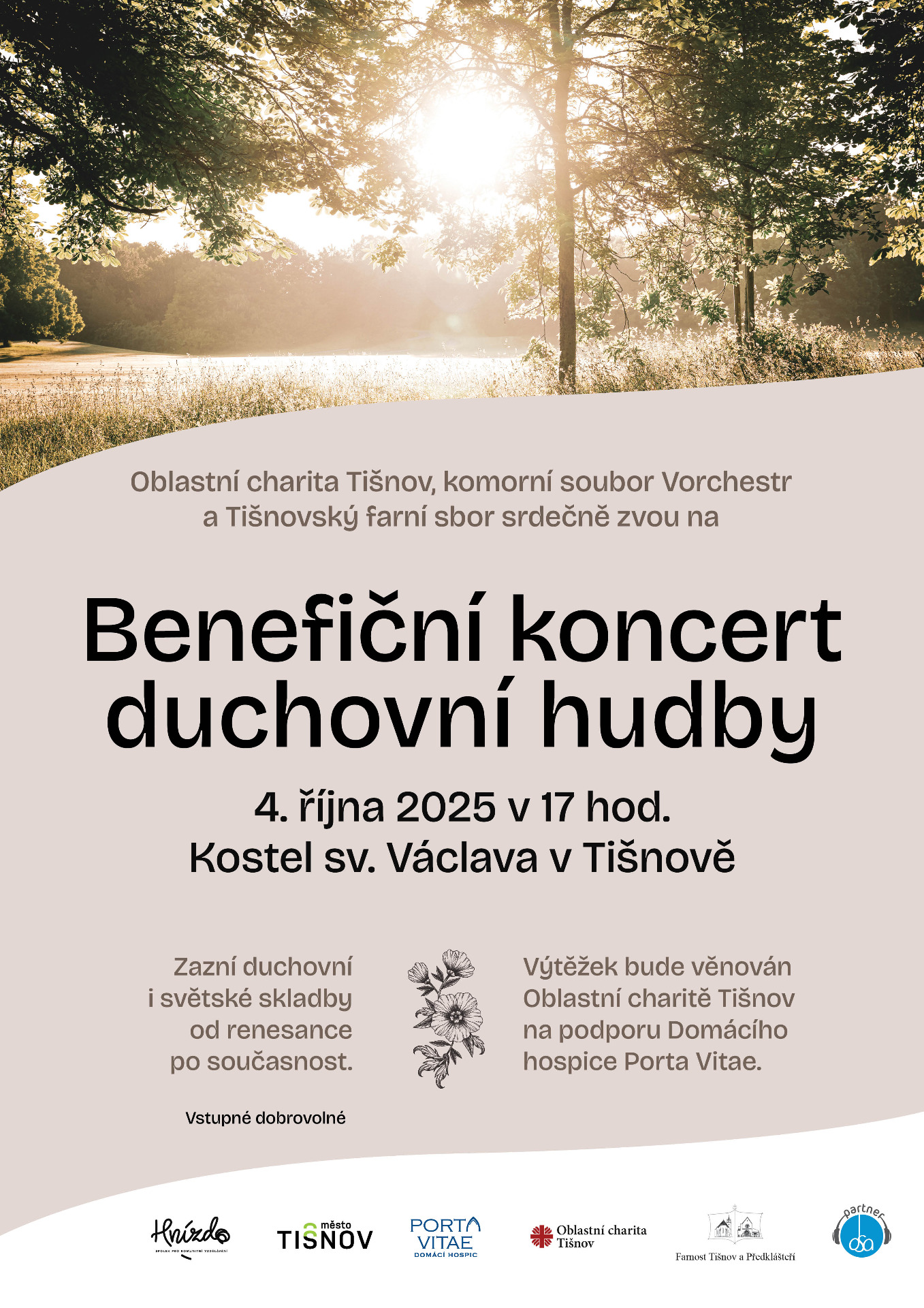 Oblastní charita Tišnov, Hnízdo - spolek pro komunitní vzdělávání, komorní soubor Vorchestr a Tišnovský farní sbor vás srdečně zvou na Benefiční koncert duchovní hudby, který se bude konat 4. října 2025 v 17hod v kostele sv. Václava v Tišnově.